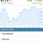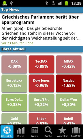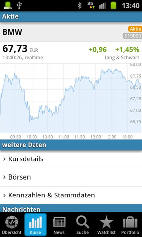 6. Finanzen100 Börse Die kostenlose Finanzen100 Börse App bietet alles, was Börsianer unterwegs benötigen: Finanznachrichten und –daten sowie Börsenkurse und –charts (Aktien, Indizes, Fonds, Anleihen, Zertifikate und Optionsscheine) für mehr als 800.000 Wertpapiere. Die Aktualisierung der Kurse erfolgt bei bestehender Internet-Verbindung in Echtzeit.