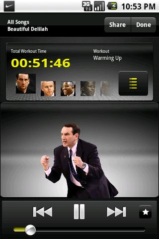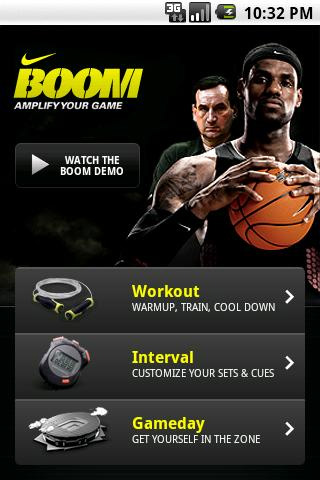 8. Nike BOOM Motivation durch Musik. Der Nutzer von Nike BOOM wählt zunächst seine passende Sportart (u. a. Fußball, Baseball, Rugby oder Laufen) und trägt anschließend seinen Trainingsplan mit den gewünschten Intervallen und die Gesamttrainingszeit in die App ein. Außerdem bestimmt er eine Playlist seiner auf dem Gerät gespeicherten Songs. Während des Trainings sorgt Nike BOOM anhand der eingegebenen Daten für die passende Musikuntermalung und reichert diese mit Motivationssprüchen von bekannten Persönlichkeiten aus der Welt des Sports an.