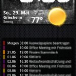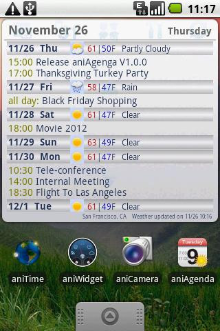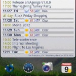 19. aniAgenda: Agenda widget Das aniAgenda: Agenda widget zeigt alle im Google Kalender vermerkten Termine der aktuellen Woche gleichzeitig an und bietet zusätzlich einen 6-tägigen-Wetterausblick. Es gibt Widgets in insgesamt drei Größen, dass Agenda widget hat allerdings eine Standardgröße von 4×3. Durch Berühren des Page Down-Buttons auf dem Widget wird die Ansicht um das nächste Datum erweitert.