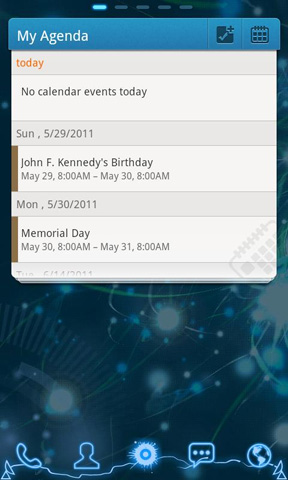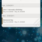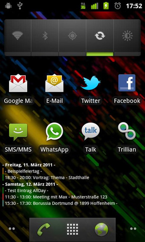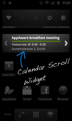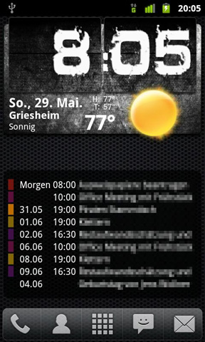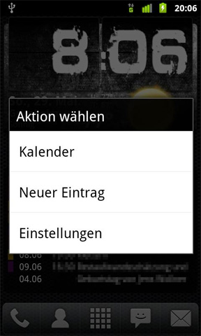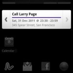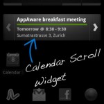 1. Glass Widgets Das Glass Calendar Widget ist ein Bestandteil der Glass Widgets zeigt das aktuelle Datum und die nächsten drei Termine aus dem Kalender an. Mit einem Fingertipp auf die Termine wird zu den danach folgenden Kalendereinträgen weitergeschaltet. Das funktioniert auch in die andere Richtung. Die Widget-Größe ist 4×1. Die Glass Widgets können kostenlos aus dem Android Market heruntergeladen werden.