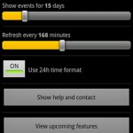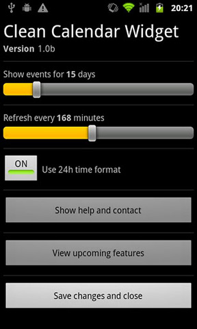 5. Clean Calendar Widget 4×2 beträgt die Standard-Größe des Clean Calendar Widgets, weitere werden Größen durch zukünftige Updates wohl noch hinzukommen. Der Nutzer kann einstellen, für welchen Zeitraum in der Zukunft Termine angezeigt werden sollen. Neben den Terminen aus dem eigenen Kalender wird auch das aktuelle Datum dargestellt. Clean Calendar Widget steht kostenlos zum Download im Android Market bereit.