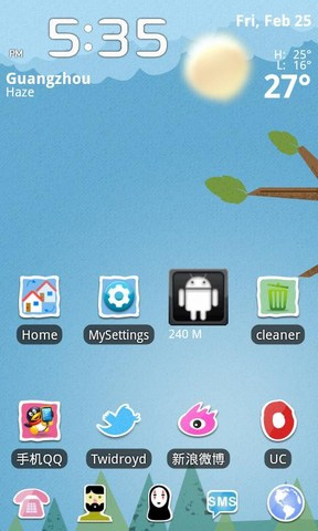 6. TSF Shell Die Oberfläche der TSF Shell unterscheidet sich besonders deutlich von der Android Oberfläche oder der anderer Launcher. Die TSF Shell besteht aus fünf Seiten, von denen eine für Apps reserviert ist. Die anderen Seiten können individuell gestaltet und jederzeit neu organisiert werden. In der unteren linken Ecke befindet sich ein Screen Switcher, mit dem die einzelnen Seiten jeweils direkt aufgerufen werden können. Außerdem gibt es eine seitliche Leiste, die sich mit Widgets, Kontakten, Ordnerboxen usw. belegen lässt.Apps können in solchen Ordnerboxen zusammengefasst werden, das Hineinlegen wird mit Drag & Drop erledigt. Auch innerhalb einer Ordnerbox lassen sich Personalisierungen vornehmen (z. B. die Reihenfolge der Darstellung der Apps). Für häufig verwendete Apps kann auch eine Schnellstart-Leiste an der Seite angebracht werden. Im Google Play Store stehen noch verschiedene Add-Ons bereit, die kostenlos heruntergeladen werden können. Dazu gehören u. a. ein Memo Widget, ein Musik Widget und ein Wetter Widget.