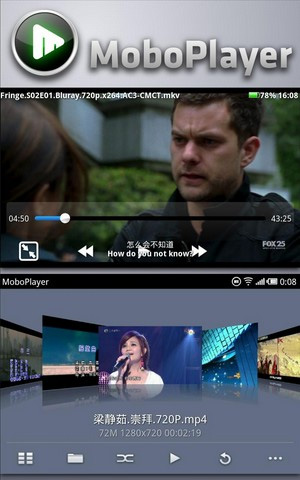 2. MoboPlayer Der MoboPlayer unterstützt fast alle bekannten Video-Formate ab und zeichnet sich durch seine gute Bildqualität aus. Bei Dateien mit zwei Tonspuren (z. B. deutsch und englisch) oder Untertiteln sich kann der Nutzer zwischen beiden Varianten wählen. Es lassen sich auch Playlisten anlegen, bei denen die ausgewählten Videos nacheinander abgespielt werden. Neben abgespeicherten Videos können mit MoboPlayer auch Streaming-Inhalte abgespielt werden. MoboPlayer steht kostenlos zum Download im Android Market bereit.