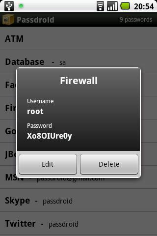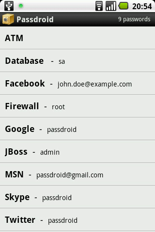 2. Passdroid Eine weitere App zur lokalen Speicherung von Passwörtern ist Passdroid, die kostenlos aus dem Android Market heruntergeladen werden kann und neben einer sicheren Datenverschlüsselung auch einen Passwort-Generator mitbringt. Passdroid bewertet auch die Sicherheit der vom Nutzer gewählten Passwörter anhand einer Skala.
