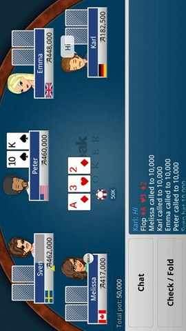 2. Appeak Poker Mit der überzeugenden Qualität von Live Hold’em und Full Tilt Poker kann nur noch eine weitere Poker-App einigermaßen mithalten: Appeak Poker. Nachdem sich der Spieler für einer der 40 Avatare entschieden hat, setzt er sich an den hübsch gestalteten Pokertisch. Dort spielt er gegen Android Besitzer aus der ganzen Welt und kann auf Wunsch per Chat mit ihnen kommunizieren. |