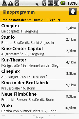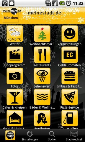3. meinestadt.de – POI & mehr Per Fingertipp kann sich der Nutzer von meinestadte.de – POI & mehr die Restaurants seiner näheren Umgebung anzeigen lassen. Alternativ stehen Imbisse & Fast Food-Läden sowie Lieferdienste (Pizza-Service) zur Auswahl. Für jeden Eintrag stehen Adresse, Kontaktdaten und Distanz zum aktuellen Standort des Nutzers zu Verfügung. Auf Knopfdruck kann eine Routenplanung per Google Maps Navigation vorgenommen werden. Auch das direkte Hinzufügen des Restaurants zum Adressbuch ist möglich. Auch meinestadt.de – POI & mehr steht kostenlos zum Download im Android Market bereit.