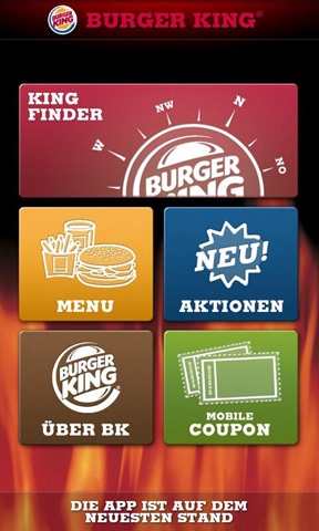 6. Burger King DE Die Schnellrestaurant-Kette Burger Kingbietet mit seiner Android App einen Filialfinder für alle der mehr als 700 Restaurants bundesweit. Darüber hinaus können sich Interessenten über die Produktpalette von Burger King informieren und durch mobile Coupons und Aktionen beim Kauf von Whoppern, Big Chilli Cheese & Co. sparen. Die Burger King DE App steht kostenlos zum Download im Android Market bereit.