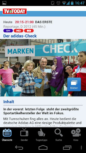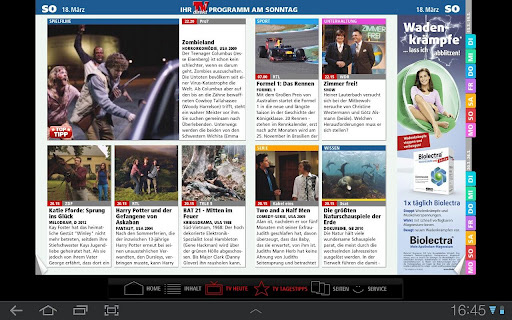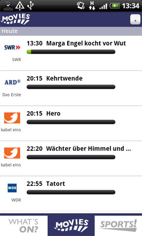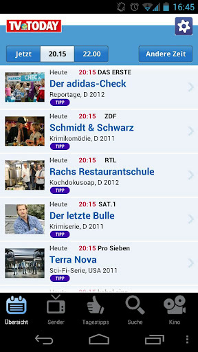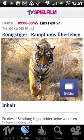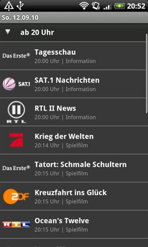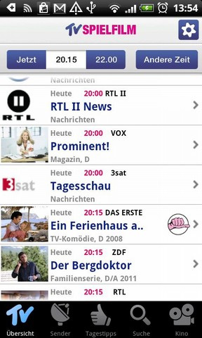 1. TV Spielfilm Die TV Spielfilm App bietet einen kompakten und schnellen Überblick auf das Fernsehprogramm von mehr als 100 Sendern. Der Nutzer hat die Möglichkeit, auf Knopfdruck die Sendungen der Prime-Time (20.15 Uhr und 22.00 Uhr) aufzurufen oder er wählt jede andere Uhrzeit aus. Die Übersicht kann alternativ auch für einzelne Sender erfolgen. Dazu bietet TV Spielfilm die Genre-Tipps des Tages, Informationen und Fotos zu den meisten Sendungen und dem aktuellen Kinoprogramm. Die TV Spielfilm App kann kostenlos aus dem Google Play Store heruntergeladen werden. Es gibt dort auch eine spezielle TV Spielfilm HD-Version für Android Tablets.
