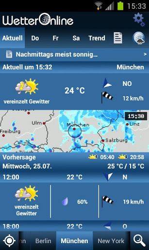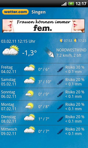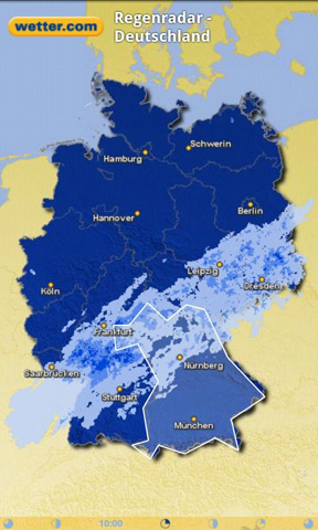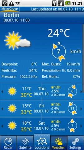 3. Wetter.com Eine Übersicht der aktuellen Wetterlage, eine Wettervorhersage für die nächsten sieben Tage, Regenradar, Unwetterwarnungen, ein Wetter-Widget, Wetterkarten und -videos sind einige Funktionen, die Nutzern mit der Android App von Wetter.com zur Verfügung stehen. Der Download der Wetter.com App aus dem Android Market ist kostenlos.