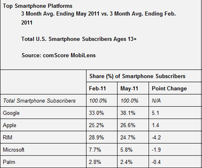 Das Marktforschungsunternehmen comScore hat für Mai 2011 eine neue Auswertung der Lage im US-amerikanischen Smartphone-Markt vorgenommen, berichtet die englischsprachige Website Phonearena. Demnach besitzt inzwischen knapp ein Drittel aller US-Bürger ab 13 Jahren ein Smartphone. In Führung liegt weiterhin Android mit einem Anteil von 38,5%, was gegenüber dem Februar 2011 einen Anstieg von 5,1% entspricht. Auf dem zweiten Platz landet ebenfalls unverändert Apple, dessen iPhone für 26,2% die erste Wahl darstellt (plus 1,4%).