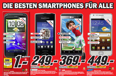 Auch der aktuelle Prospekt der Elektronik-Kette Media Markt kommt natürlich nicht ohne ein paar attraktive Android Smartphone-Angebote aus. So gibt es beispielsweise das hervorragende HTC Sensation schon für 1 Euro (ohne Vertrag 399 Euro). Noch günstiger ist das brandneue Sony Ericsson Xperia Ray in Gold, das für 249 Euro ohne Vertrag angeboten wird. Wer es gerne dreidimensional mag, findet das passende Smartphone im LG Optimus 3D für 369 Euro. Für Entzücken dürfte aber natürlich auch das Samsung Galaxy S 2 sorgen, das der Media Markt für 449 Euro im Angebot hat. Mit der 0%-Finanzierung können alle Geräte auch bequem in zehn Monatsraten bezahlt werden.