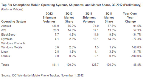 Dass die vierjährige Historie von Android eine Erfolgsgeschichte sondergleichen darstellt, wird niemand ernsthaft bestreiten wollen. Vor allem dann nicht, wenn man sich die aktuellsten Zahlen ansieht, die das Marktforschungsunternehmen IDC zur weltweiten Verteilung von Smartphone-Auslieferungen weltweit ermittelt hat. Demnach kam Android im dritten Quartal 2012 auf einen schwindelerregenden Marktanteil von 75%. Bei einer Gesamtauslieferungsmenge von 181 Millionen Smartphones würde dies bedeuten, dass fast 136 Millionen davon mit dem Google OS ausgestattet waren. Auf dem zweiten Platz unter den Betriebssystemen folgt wenig überraschend Apple, die auf einen Anteil von 14,9% kamen. Während Symbian und Blackberry im Vergleich zum Vorjahr weiter Federn lassen musste, konnte sich Microsoft mit Windows Mobile zumindest auf niedrigem Niveau steigern. 3,5% Marktanteil stehen den 2% gegenüber, die Windows Mobile im dritten Quartal 2011 erreichen konnte.