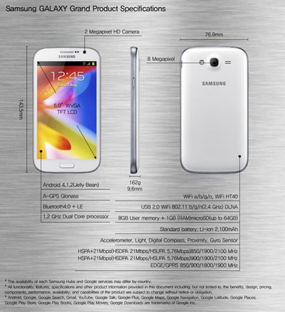 Wir gehen nicht davon aus, dass es das Samsung Galaxy Grand nach Deutschland schaffen wird. Aber da es bisher noch keine offizielle Ankündigung dazu gibt, wollen wir es auch nicht ausschließen. Das Galaxy Grand verfügt über ein 5,0 Zoll Display (Auflösung: 480×800 Pixel), einen 1,2 GHz Dual Core Prozessor, Android 4.1 (Jelly Bean), 1 GB RAM, 8 GB internen Speicher und eine 8,0 Megapixel Kamera, berichtet die englischsprachige Website Eurodroid. Auch eine Dual-SIM Version des Smartphones soll angeboten werden. Wahrscheinlich wird Samsung das Gerät in Asien und eventuell auch Osteuropa anbieten.