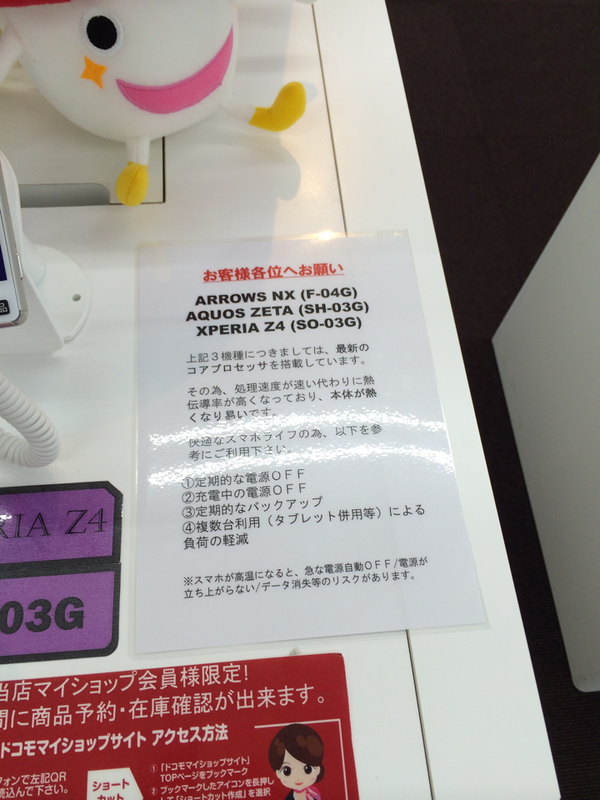 Japanische Provider hatten potentielle Käufer bereits vor der Wärmeentwicklung mit dem verbauten Snapdragon 810 gewarnt und ihnen empfohlen, das Gerät hin und wieder, vor allem beim Laden, komplett auszuschalten. NTT DoCoMo weist seine Kunden auf dem entsprechenden Datenblatt sogar mit einem Verweis in Bezug auf dieses Problem explizit hin.