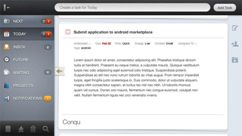 Die Auswahl an Notizblock- und To-Do-Listen Apps im Android Market wird durch das große Angebot nicht überschaubarer. Aus diesem Grund präsentieren wie jeweils unsere Auswahl der besten Notizblock-Apps für Android und die besten To-Do-Listen Apps für Android. Eine Mischung aus beiden Kategorien bietet Conqu, dessen Oberfläche auch für den Einsatz auf Tablets mit Android 3.0 (Honeycomb) optimiert ist.