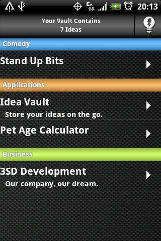 Mit Idea Vault lassen sich Ideen in Form von Texten, Bildern und Sprachaufnahmen speichern. Nach dem ersten Start der App erscheint die Ideenübersicht. Hier sind bereits einige Beispielideen zu sehen, die sich natürlich jederzeit löschen lassen (durch einen langen Tastendruck und anschließender Auswahl des Löschen-Befehls). Über die Funktionstaste des Android Gerätes legt der Nutzer ein Menü offen. Hier befindet sich u. a. der Zugang zur Eingabe neuer Ideen.