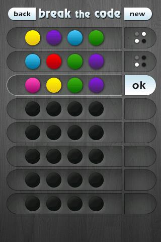 Break The Code ist ein Android Puzzle Spiel im Stile des bekannten Brettspielklassikers Mastermind. Das Ziel des Spielers liegt darin den Farbcode zu knacken, bevor er seine bis zu 12 Spielzüge aufgebraucht hat. Nach jeder Runde erfährt er, wie viele richtige Farben er bisher ausgewählt hat und wie viele davon am richtigen Platz liegen.