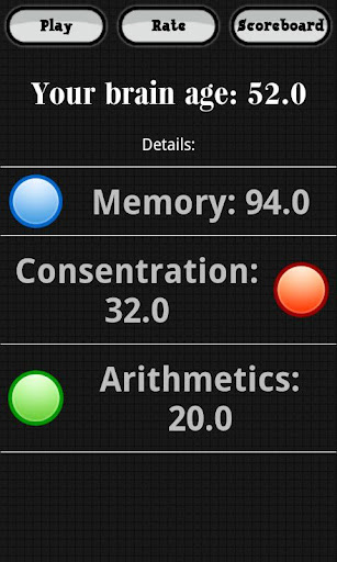 2. Brain Age Spiel Mit Brain Age Spiel lässt sich in drei verschiedenen Disziplinen das eigene geistige Alter bestimmen. Neben eine Memory-Variante, bei der die Farbkugeln nach kurzer Vorführung in der richtigen Reihenfolge berührt werden müssen, gibt es kleine Rechenaufgaben, bei denen sich der Nutzer schnell für eine von vier Optionen (Plus, Minus, Mal und Geteilt) entscheiden muss sowie eine Konzentrationsaufgabe, bei der Zahlen in der richtigen Reihenfolge berührt werden müssen. Diese haben sich zuvor an eine andere Stelle bewegt. Brain Age Spiel kann kostenlos aus dem Google Play Store heruntergeladen werden.