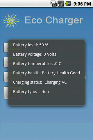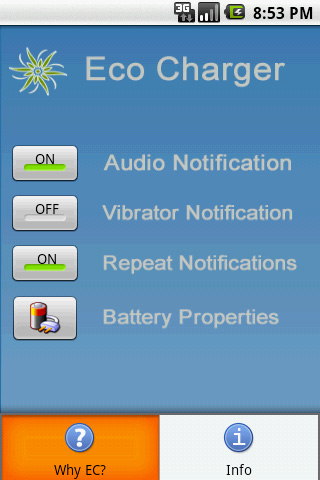 2. Eco Charger Auch wenn der Akku des Smartphones voll aufgeladen ist, das Gerät aber weiterhin an die Steckdose angeschlossen ist, wird eine Menge Strom verbraucht. Eco Charger erinnert den Nutzer daran, dass er das Gerät mit dem geladenen Akku von der Stromquelle trennen kann. Dies kann wahlweise durch einen Benachrichtigungston oder per Vibrationsalarm geschehen. Eco Charger steht zum kostenlosen Download im Android Market bereit.
