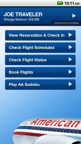 12. American Airlines Mit der App von American Airlines hat der Nutzer alle Fluginformationen jederzeit mit dabei. Er kann außerdem neue Flüge buchen, Check-Ins vornehmen sowie das Smartphone als elektronische Bordkarte verwenden. Wartezeiten kann er sich mit einer Runde des Spiels Sudoku vertreiben, dass die Entwickler ebenfalls in die App integriert haben. Die American Airlines App wird kostenlos im Android Market angeboten.