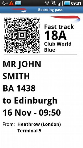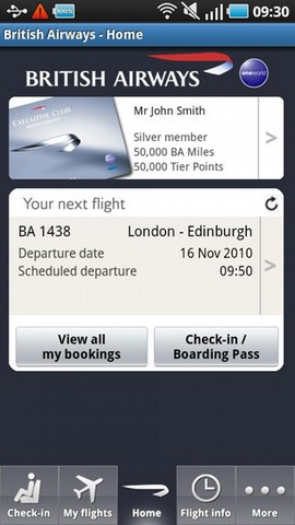 4. British Airways Ein ähnliches Angebot umfasst auch die App von British Airways: Der Nutzer kann Informationen zu seinen Flügen abrufen, Online Check-Ins vornehmen, sich die elektronische Bordkarte zusenden lassen und vieles mehr. Mit dem integrierten Widget können die Fluginformationen auch jederzeit sichtbar auf dem Homescreen des Smartphones platziert werden. Auch die British Airways App kann kostenlos aus dem Android Market heruntergeladen werden.
