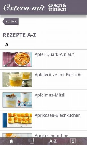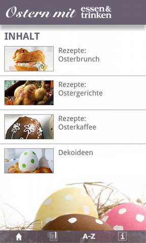 2. Ostern mit essen&trinken Die App Ostern mit essen&trinken bietet nicht nur mehr als 100 österliche Kochrezepte für jede Tageszeit, sondern liefert auch gleiche passende Dekorationstipps mit. Zu jedem Oster-Rezept stehen ein Foto, die Zutatenliste und eine Anleitung für die Zubereitung zur Verfügung und für die Dekorationsvorschläge die entsprechende Bastelanleitung. Außerdem bringt die Ostern mit essen&trinken App eine Einkaufslisten-Funktion mit.