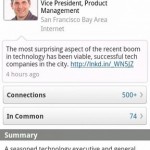 3. Droidin Mit Droidin steht ein weiterer Client für das den USA stammende Netzerk LinkedIn bereit, der kostenlos im Android Market heruntergeladen werden kann. Damit lassen sich die Profile, Kontaktdaten und Emails von vernetzten Personen abrufen, Kontaktanfragen stellen oder bestätigen und vieles mehr. Die Statusmeldungen der Kontakte werden als News Stream untereinander dargestellt und können direkt aus der App heraus kommentiert werden.