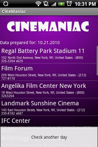 10. CineManiac Ebenfalls kostenlos ist die App CineManiac, mir der alle Kinos und dazu passenden Kinoprogramme der gesamten Stadt abrufen lassen. CineManiac steht in vier verschiedene Sprachen zur Verfügung (deutsch, englisch, französisch und polnisch). Der Nutzer kann entweder nach den Filmen suchen, die als nächste in den Kinos gezeigt werden oder er sucht nach einem konkreten Film und erhält dessen Spielzeiten.