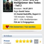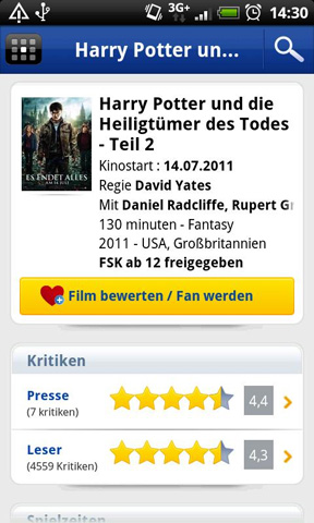 7. Filmstarts Mit der Filmstarts App haben Nutzer Zugriff auf Informationen zu mehr als 23.000 Kino- und Fernsehfilmen, 2.000 Kinos und knapp 200.000 Schauspielerinnen und Schauspieler. Mit der Umkreis-Suche finden sie außerdem immer das nächstgelegene Lichtspielhaus. Für viele aktuelle Filme stehen außerdem Kino-Trailer sowie Presse- und Besucherkritiken zur Verfügung. Es können auch eigene Rezensionen geschrieben werden. Die Filmstarts App steht kostenlos im Android Market zum Download bereit.