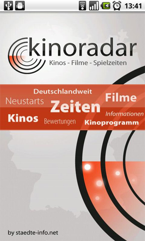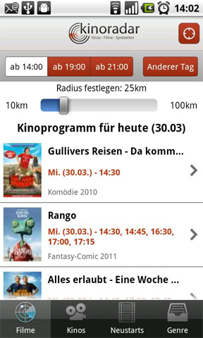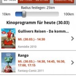 3. kinoradar – Kino, Filme & mehr kinoradar – Kino, Filme & mehr bietet eine Übersicht des Kinoprogramms deutschlandweit an. Auch alle Kinos lassen sich mit ihrer jeweiligen Entfernung zum aktuellen Standort anzeigen. Die Filme lassen sich entweder nach den aktuellen Neustarts oder ihren entsprechenden Genres filtern. Die kinoradar – Kino, Filme & mehr App kann kostenlos aus dem Android Market heruntergeladen werden.