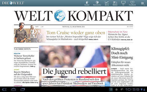5. DIE WELT Mit der App von DIE WELT haben Android Tablet-Nutzer nicht nur Zugriff auf das Angebot von Welt Online mitsamt 24-stündigem News-Ticker, Börsenkursen, dem TV-Programm sowie dem Wetterbericht, sondern auch auf die gedruckte Ausgabe von DIE Welt kompakt. Diese kann sogar schon am Vorabend gelesen werden, bevor sie am nächsten erst an den Zeitungskiosk kommt. Das Angebot von DIE WELT kompakt kann 30 Tage kostenlos getestet werden, danach kann der Nutzer über den Weiterbezug entscheiden. Die App selbst steht kostenlos zum Download im Android Market bereit.