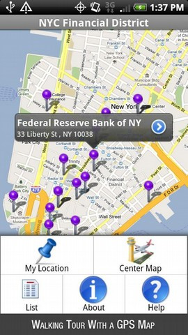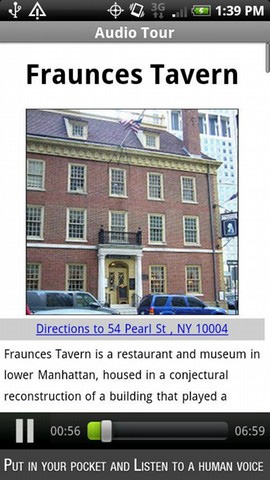 8. New York Audio Tour Guide Der New Yorker Finanzbezirk bietet zahlreiche Sehenswürdigkeiten, die sich am besten zu Fuß erkunden lassen. Das Android Smartphone wird dabei durch den New York Audio Tour Guide zum virtuellen Reiseführer. Die App bietet Audio-Informationen zu den 15 wichtigsten Orten des Finanzbezirks. Mit GPS und der integrierten Karte können die entsprechenden Sehenswürdigkeiten ganz leicht gefunden werden. Für die Audiodateien werden etwa 30 MB Speicherplatz auf der SD-Karte benötigt.