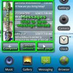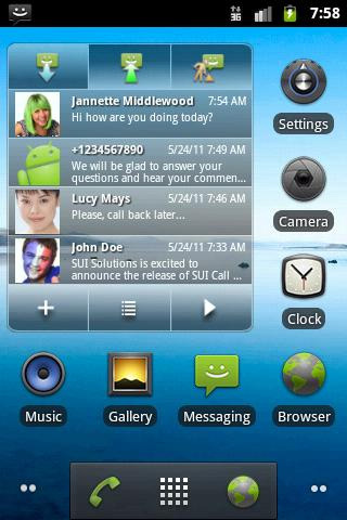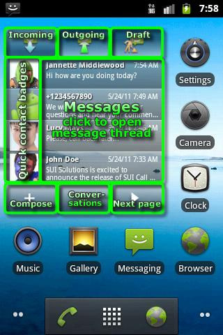 4. SUI SMS Widget Wer hingegen seine komplette SMS-Kommunikation direkt vom Homescreen aus im Blick behalten möchte, wird wahrscheinlich Gefallen an SUI SMS Widget finden. Das 3×3 große Widget zeigt immer vier SMS gleichzeitig an. Durch Berührung des Pfeils in der unteren Ecke können die nächsten vier SMS aufgerufen werden. Außerdem ist es ebenfalls möglich, nur selbst versendete SMS darzustellen oder direkt zur Eingabe einer neuen SMS zu springen. Auch SUI SMS Widget kann kostenlos aus dem Android Market heruntergeladen werden.