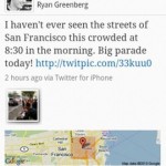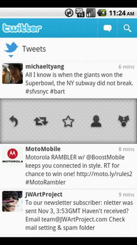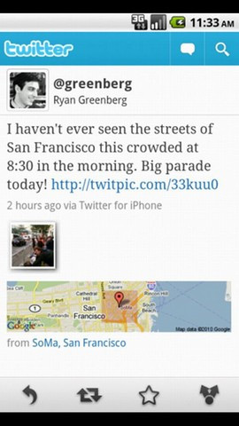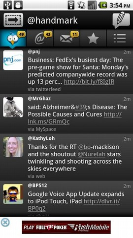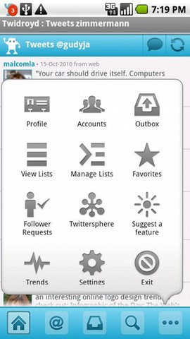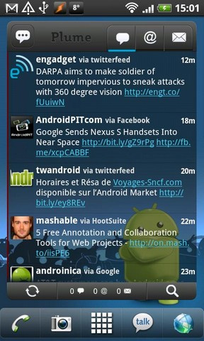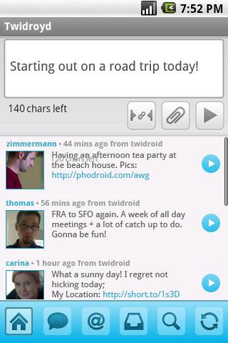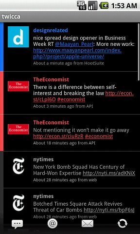 4. twicca Durch seine dunkle Gestaltung ist die Nutzung von twicca besonders akkuschonend. Aber das ist nicht das Einzige, womit diese Twitter App punkten kann. Alle denkbaren Funktionen sind mit an Bord und sie bietet auch die Möglichkeit, Tweets mit Geodaten anzureichern und damit an einen bestimmten Ort zu koppeln. Bereits mehr als 350.000 Downloads sprechen für die Qualität von twicca, die ebenfalls kostenlos aus dem Android Market heruntergeladen werden kann. Für twicca sind bereits diverse Zusatz-Plugins erschienen, mit denen der Zugriff auf weitere soziale Netze wie Flickr, Facebook oder Picasa ermöglicht wird.