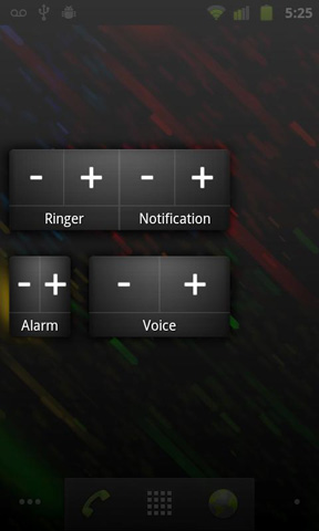 5. Volume Widget Mit dem Volume Widget kann der Nutzer die Lautstärke für den Klingelton direkt über das Widget festlegen. Dafür hält das in den Größen 1×1, 2×1 und 3×1 vorliegende Widget entsprechende Felder mit Plus und Minus bereit. Auf dem Volume Widget mit der Größe 3×1 kann außerdem noch die Audiolautstärke für Musik, Videos etc. verändert werden. Auch das Volume Widget steht kostenlos zum Download im Android Market bereit.