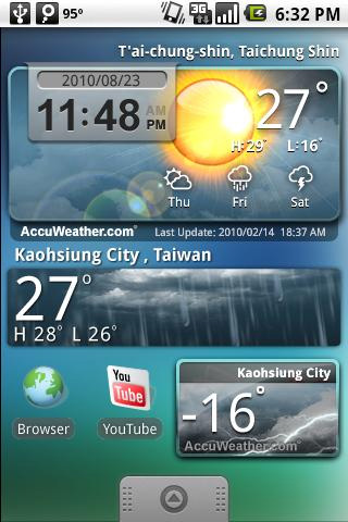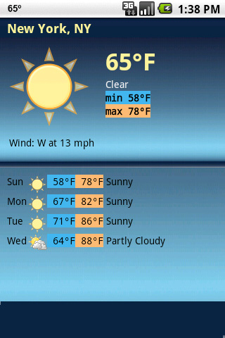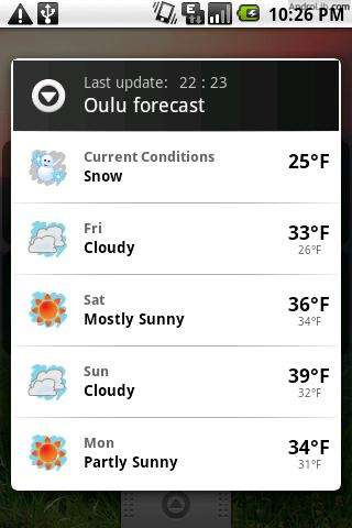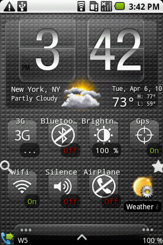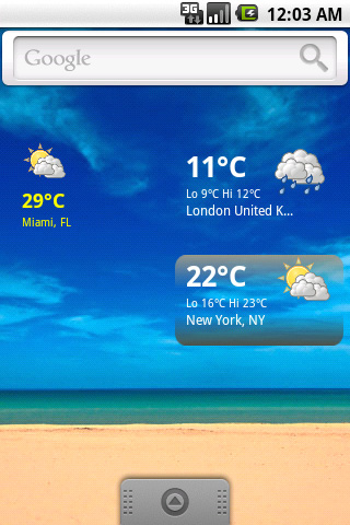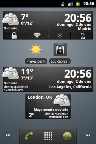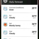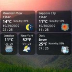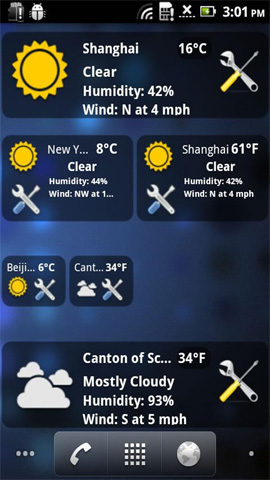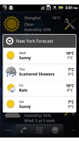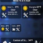 5. Weather Forecast Das Weather Forecast Widget kann in zwei unterschiedlichen Größen ausgewählt werden (2×1 und 4×1). Das 4×1 große Widget kann neben dem Wetter noch mit Schalter-Buttons wie dem Ein- und Ausschalten der WLAN-Verbindung oder Bluetooth belegt werden. Ein Widget kann das Wetter für bis zu drei Orte gleichzeitig anzeigen. Die Wettervorhersage ist jeweils für die nächsten drei Tage. Weather Forecast kann kostenlos aus dem Android Market heruntergeladen werden.