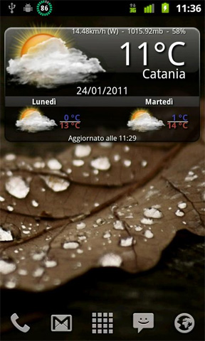 11. WMD-Weather Lite WMD-Weather Lite kann bis zu Sechs-Tages-Vorhersagen sowie das aktuelle Wetter anzeigen. Die Orte – für die Wetterinformationen eingeblendet werden sollen – werden per GPS oder durch manuelle Eingabe bestimmt. Der Hintergrund des Widgets kann vom Nutzer verändert werden. Auch das Aktualisierungsintervall für die Wetterdaten ist einstellbar. WMD-Weather Lite steht kostenlos im Android Market zum Download bereit.