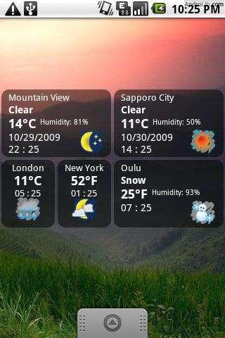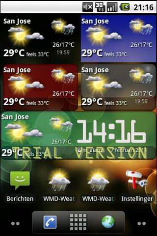 16. 9s-Weather Die kostenlose Wetter-App 9s-Weather bietet insgesamt vier verschiedenen Widgets zum Anzeigen des Wetters an. Die größte Variante (4×2) stellt dabei ein kombiniertes Uhren- & Wetter-Widget dar. Außerdem hat der Nutzer die Wahl zwischen den Größen 4×1, 4×2 und 2×1. Darauf werden die Wetterdaten von Accuweather angezeigt.Mit 9s-Weather lassen sich Wettervorhersagen bis zu drei Tage in die Zukunft darstellen. Celsius und Fahrenheit werden beide unterstützt. Der Clou von 9s-Weather liegt in den wechselbaren Skins, die sich separat aus dem Android Market herunterladen lassen und die genügend Spielraum zum Anpassen der Optik an den eigenen Geschmack zulassen.